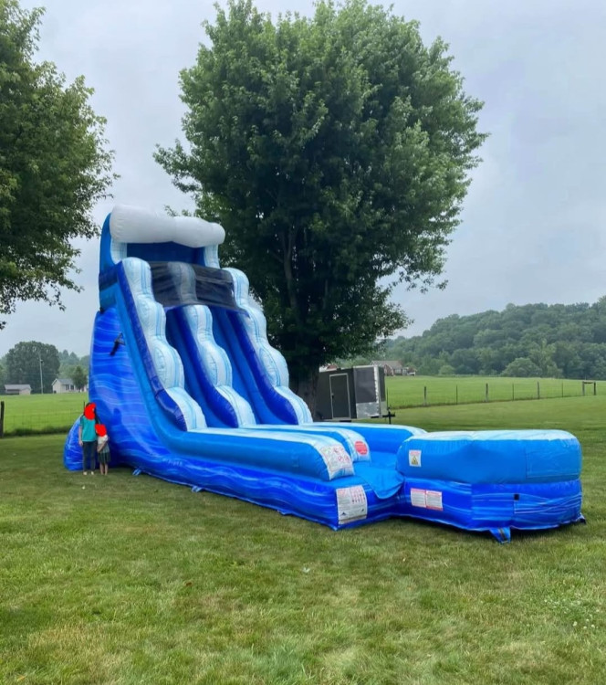 Evoke the thrill of a seaside adventure with this towering 18-foot Blue Marble Wave — a striking, ocean-colored inflatable slide built to deliver big, splash-free fun for parties, school events, and backyard blowouts. Standing eighteen feet tall, its sweeping blue-and-cerulean marble pattern gives an instant visual wow that draws guests in; the wide sliding lane and gently arched runout are designed to accommodate riders of many ages, offering a fast, smooth descent that feels safe and exciting. Constructed with heavy-duty, puncture-resistant materials and reinforced seams, it’s made to withstand repeated use across days of rental and to anchor securely to a lawn, pavement, or other flat surface with standard safety tie-downs.
